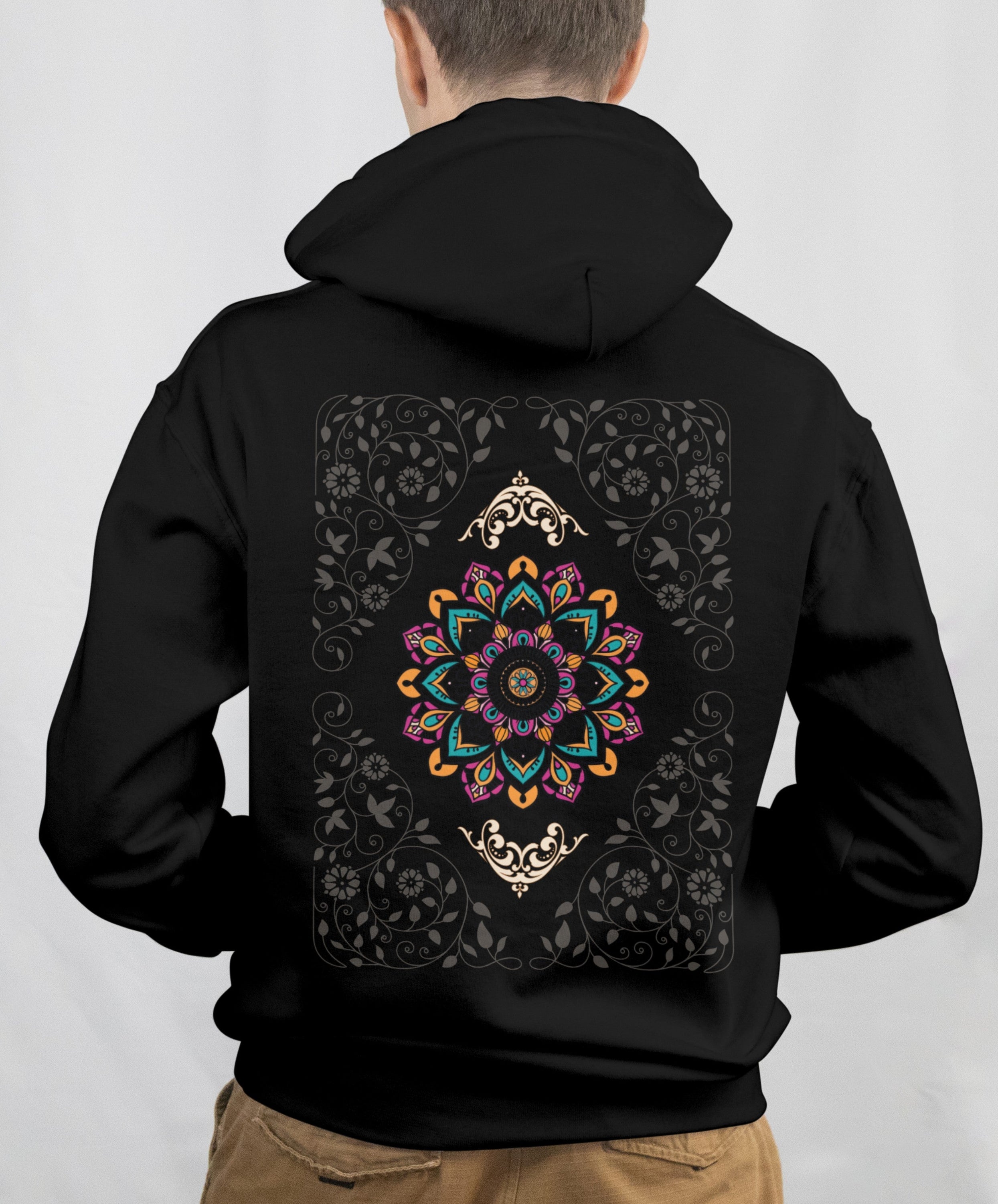 Our Serenity Mandala Oversized Drop Shoulder Hoodie combines spiritual elegance with modern streetwear vibes. At the heart of this piece is a meticulously detailed, multi-colored mandala, bursting with shades of teal, orange, magenta, and gold, symbolizing balance and harmony.